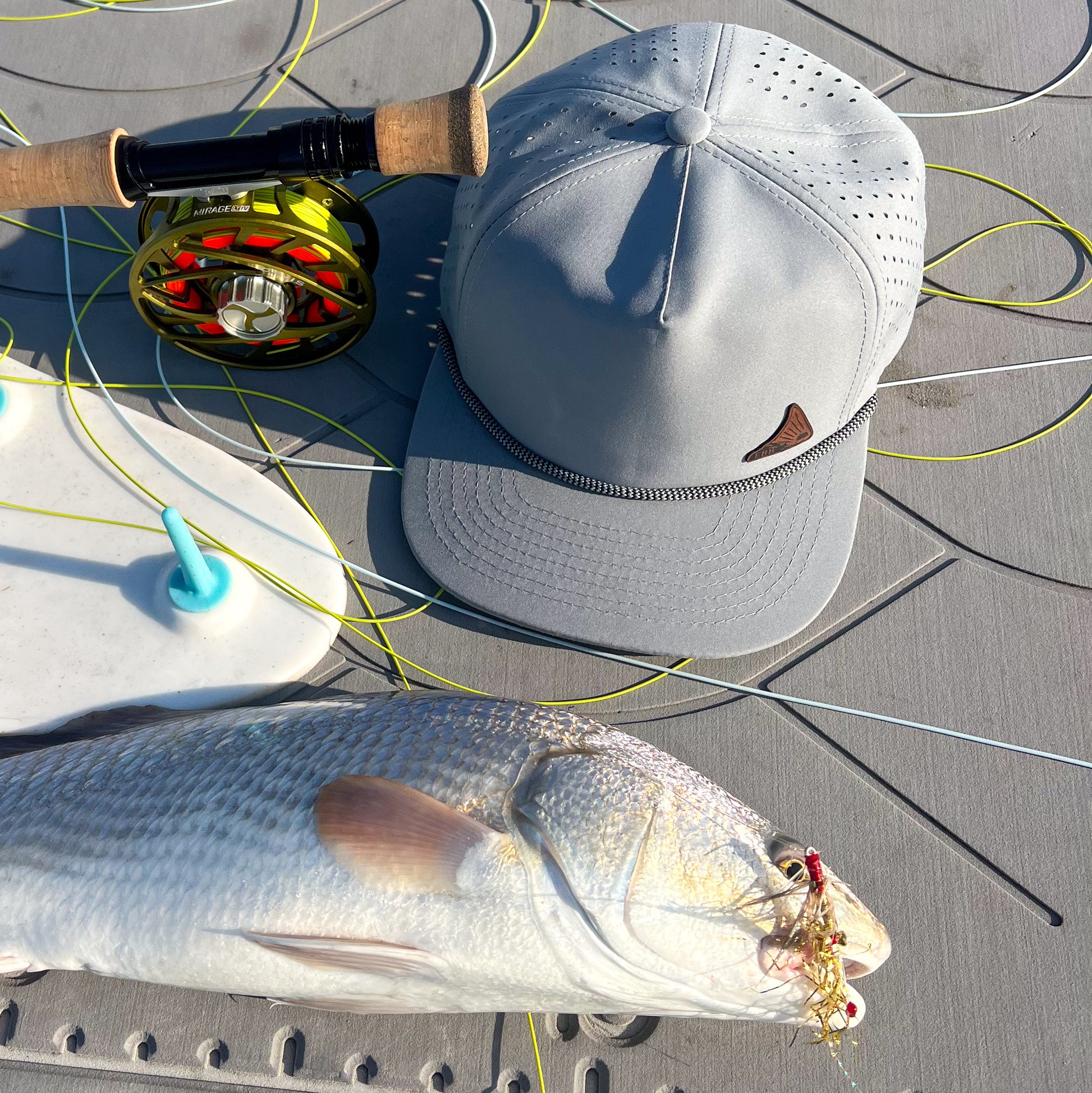 Crafted with performance fabric and laser-cut side vents, this hat keeps you cool when the marsh gets still and the sun stands high. The structured fit holds its shape, while the front rope nods to timeless waterman style. Finished with our signature minimalist redfish tail patch — a mark of quiet pursuit.